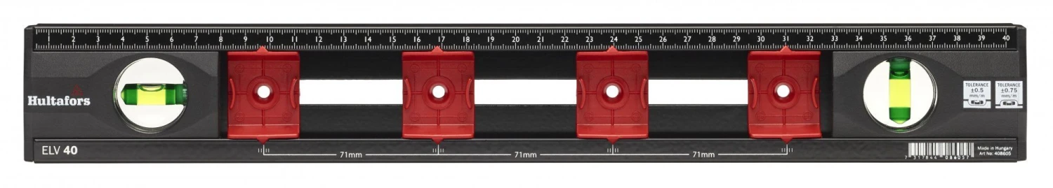 Het C-vormige aluminium profiel heeft kunststof eindstukken en rubberen afstandhouders die de waterpas beschermen en voorkomen dat hij van het meetoppervlak glijdt. De schuifmarkeringen met een afstandindicatie van 71 mm van het midden zorgen voor een snelle en nauwkeurige positionering bij het installeren van schakel- of aansluitdozen volgens DIN 49075.