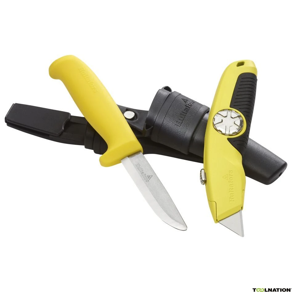 Dit dubbele Hultafors holster combineert twee veiligheidsmessen: het veiligheidsmes SK en het utiliteitsmes USRA. Het SK veiligheidsmes is ontworpen met een stompe punt, zodat deze veilig kan worden gebruikt en snijwonden worden voorkomen. Het is de perfecte keus voor de vakman die veiligheid voorop heeft staan. Het USRA utiliteitsmes is voorzien van een mes dat terug in de behuizing schuift wanneer deze niet gebruikt wordt. Dit voorkomt steekwonden. Beide messen hebben een stompe punt voor werkzaamheden waarbij een scherpe punt niet gewenst of toegestaan is. Dankzij het dubbele holster heb je altijd jouw twee favoriete messen binnen handbereik. Zo kun je snel en efficiënt werken. Het dubbele holster is gemaakt van impactbestendig PP-plastic en voorzien van een elastische lus. Het dubbele holster is verkrijgbaar voor verschillende messencombinaties. Is je mes aan vervanging toe dan vul je de holster eenvoudig met een nieuw exemplaar.
