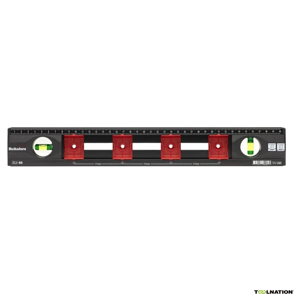 Hultafors waterpas ELV 40 is erg praktisch voor elektrische installaties. Het C-vormige aluminium profiel heeft kunststof eindstukken en rubberen afstandhouders die de waterpas beschermen en voorkomen dat hij van het meetoppervlak glijdt. De schuifmarkeringen met een afstandsindicatie van 71 mm van het midden zorgen voor een snelle en nauwkeurige positionering bij het installeren van schakelmateriaal volgens DIN 49075.