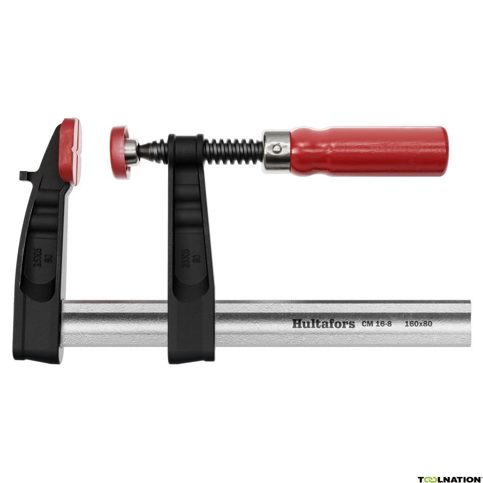 Sterke Hultafors lijmklem met een bek van impactbestendig gietijzer en een houten handvat. De geleider met profiel is voorzien van een nikkel hardverchromen deklaag en heeft aan weerszijden groeven om verschuiven na fixatie te voorkomen. Lijmklem CM heeft een sterke vlakke schroefdraad met kantelende drukplaat en plastic beschermkappen.