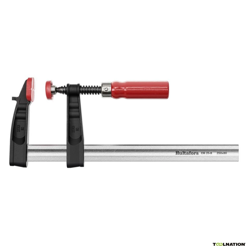 Sterke Hultafors lijmklem met een bek van impactbestendig gietijzer en een houten handvat. De geleider met profiel is voorzien van een nikkel hardverchromen deklaag en heeft aan weerszijden groeven om verschuiven na fixatie te voorkomen. Lijmklem CM heeft een sterke vlakke schroefdraad met kantelende drukplaat en plastic beschermkappen.