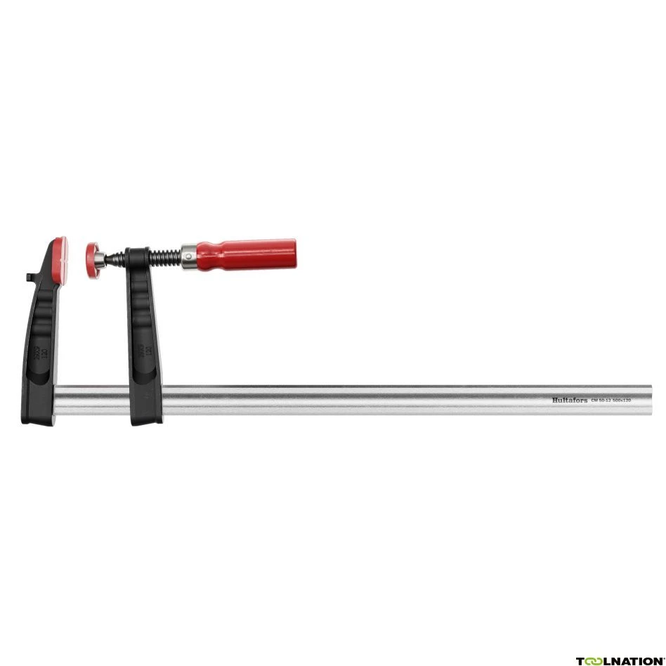 Sterke Hultafors lijmklem met een bek van impactbestendig gietijzer en een houten handvat. De geleider met profiel is voorzien van een nikkel hardverchromen deklaag en heeft aan weerszijden groeven om verschuiven na fixatie te voorkomen. Lijmklem CM heeft een sterke vlakke schroefdraad met kantelende drukplaat en plastic beschermkappen.