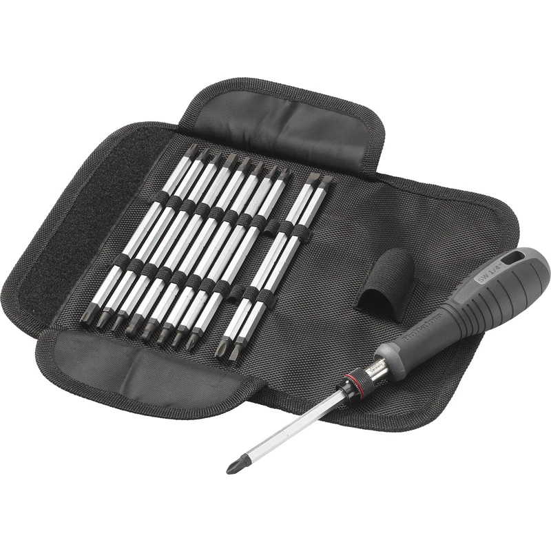 • Bevat slot bits 3.5, 4.0, 5.5, 6.5, PH 1, 2 en 3, PZ 1, 2 en 3, Hex 2, 2.5, 3, 4, 5 en 6,5 mm, Torx® T10, 15, 20, 25 , 30, 40 en 45, magnetische bithouder 6, 8, 10 en 13 mm plus 60 mm bithouder