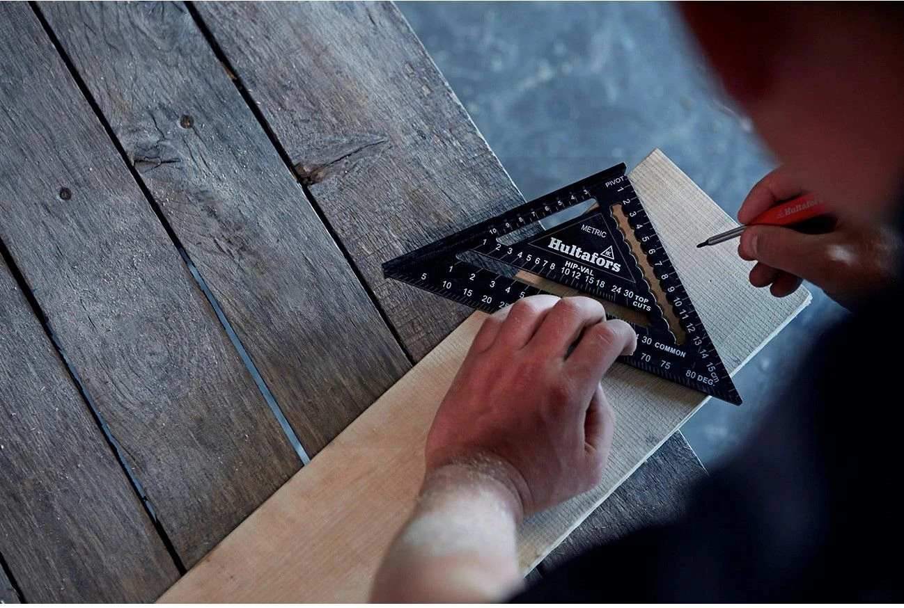 De Rafter Square is een extreem veelzijdig stuk gereedschap voor alle vakmannen en vrouwen. Je kunt hem gebruiken voor het nauwkeurig aftekenen van 45° en 90°-hoeken. Hij kan ook worden gebruikt als gradenboog, voor het eenvoudig meten en aftekenen van andere hoeken. De dikke en robuuste rand is bovendien handig als geleider bij het werken met elektrische zagen, voor zagen onder een hoek 45° en 90° en, met een beetje handigheid of een klem, ook voor andere hoeken. De rafter square heeft ook inkepingen die kunnen worden gebruikt om lijnen langs een rand te trekken met een potlood of direct met een mes te snijden bij het werken met gipsplaten. En natuurlijk heeft de middelgrote en grote versie de originele schaalverdeling voor het zagen van zadeldak en schilddak spanten en daktegels.