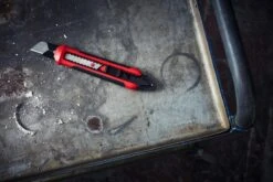 De SFRP 18A is een ergonomisch afbreekmes met staartvin voor allround gebruik, zoals het zagen van gipsplaat, isolatie en hout. Het ontwerp met rubberen greep maakt het geschikt voor materialen die meer kracht vereisen. Taps toelopend voor betere zichtbaarheid, toegang en controle. De staartvin steekt op efficiënte wijze tapijten of opent blikken. Het mes kan een dispenser met 3 reservemessen bevatten en is gemaakt van duurzaam PC-plastic (polycarbonaat) met een stalen kern voor extra stabiliteit. 1mm dik metalen mesgeleider voor meer stabiliteit.